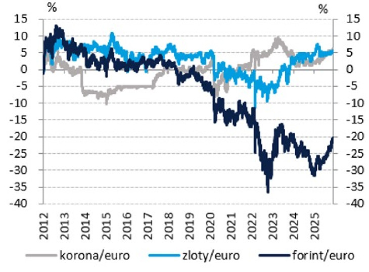 A forint erősen volatilis, az időszak egészében jelentősen gyengült. Inkább az látszik, hogy a folyamat során váltakoznak a hosszabb gyengülő és a rövidebb erősödő szakaszok az euróhoz mért nominális árfolyamot tekintve. A reálárfolyam, vagyis a hazai infláció mértékével korrigált érték, ettől eltérő mintázatot mutat: 2025 különösen nagy reálfelértékelődést hozott az amerikai dollárhoz képest, és jelentőset az euróval szemben, hiszen a hazai fogyasztóiár-indexen mért belső pénzromlási ütem „csak” négy és öt százalék közötti.