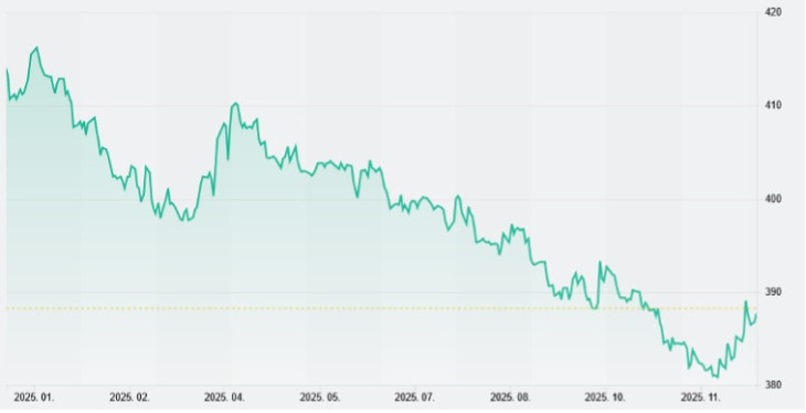 Az euró/forint-árfolyam alakulása 2025-ben
