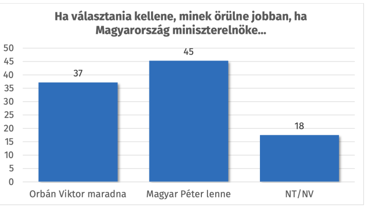 A magyar politikai kampányok gyakran a miniszterelnök-jelöltek személye körül forognak, ez különösen igaz a mostani választási kampányra, amely egyértelműen Orbán Viktor és Magyar Péter párharcáról szól, miután az elmúlt két év teljes ellenzékváltását követően Magyar képes volt az ellenzéki szavazók túlnyomó többségét maga mellé állítani a kormányváltás ígéretével. A pártpreferenciákkal összhangban a többség Magyar Pétert szeretné látni a miniszterelnöki székben, 45 százalék választaná őt, szemben Orbán 37 százalékával. 18 százalék nem tudott választani kettejük közül. Ezek alapján mind Magyarnak, mind Orbánnak van némi húzóereje saját pártszavazóin felül, előbbi 10, utóbbi 7 százalékpontos többlettel bír a pártpreferenciákhoz képest.