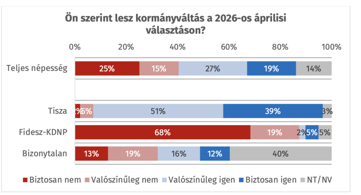 Működik a Magyar Péter és a Tisza Párt által épített narratíva, miszerint 2026 egy lefutott meccs, és a kormánypártok már vereségre készülnek, korábbi évekkel ellentétben az ellenzéki szavazók tényleg bíznak a változásban, elhiszik, hogy megtörténhet a kormányváltás. A kormánypártiak így is magabiztosabbak az igazukban, hiába vannak kevesebben, de zsinórban négyszer bevált, míg az ellenzékieknek többszörösen csalódnia kellett, így érthető, hogy kevesebben vannak, akik teljes bizonyossággal hisznek abban, hogy változás jön, akkor is, amikor az általános hangulat és a pártpreferenciák kormányváltást prognosztizálnak.