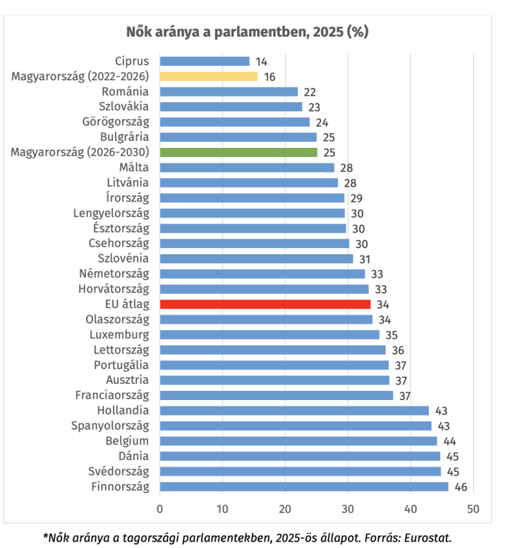 Az EU-ban átlagosan a tagországi parlamenti képviselők egyharmada nő, ami a leköszönő magyar parlamenthez képest kétszeres arány. A Tisza győzelme után alakuló parlamentben 25 százalékos női aránnyal Magyarország továbbra is az EU-átlag alatt lesz, de jó pár helyezést javít: 27. helyett 21. lesz az EU-ban. A Tisza-frakción belül a nők aránya egyébként megfelel a jelenlegi EU-átlagnak, és igaz volt ez a párt teljes jelöltállítási folyamatára: az előválasztási jelöltek és a nyertesek között is egyharmados volt a nők aránya.