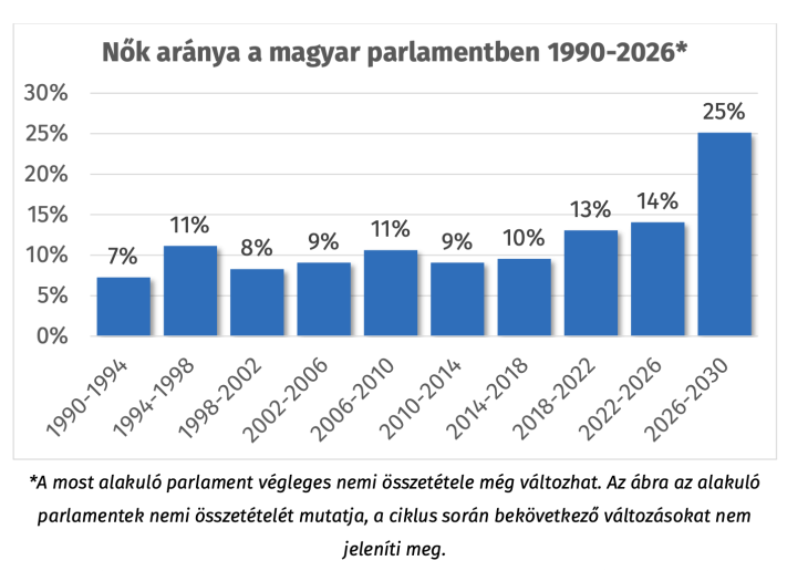 2026-ban a képviselőnők túlnyomó többségét a Tisza-frakció adja majd, a 141 fős frakció egyharmada nő. A Mi Hazánk 2, a Fidesz előre láthatólag 5 (10 százalék) női képviselőt fog a parlamentbe küldeni.