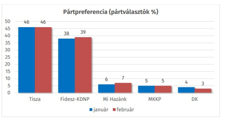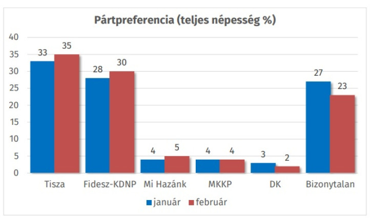 A Tisza 5 százalékponttal vezet a Fidesz-KDNP-vel szemben a teljes népesség körében, 35-30 az állás. A pártválasztók között 7 százalék a Tisza előnye, 46 százalék szavazna a pártra, a Fidesz-KDNP támogatottsága 39 százalék. A biztos szavazó pártválasztók körében a Tisza 47, a Fidesz-KDNP 39 százalékon áll, a Tisza így 8 százalékponttal vezet e körben.
