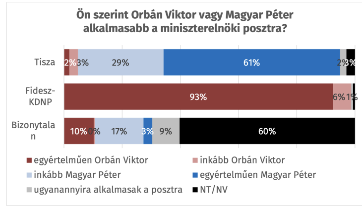 A pártpreferencia szerinti bontás segít a helyzet megértésében. A Fidesz szavazók 93 százaléka „egyértelműen”, 6 százaléka „inkább” Orbánt tartja alkalmasnak, a Tisza tábor némileg megosztottabb: 61 százalék szerint egyértelműen, 29 szerint „inkább” Magyar az alkalmas. A bizonytalanok 60 százaléka nem tud válaszolni erre a kérdésre, viszont körükben Magyar Péter alkalmassága a kétszerese Orbán Viktorénak, 20 százalék a 10-zel szemben.