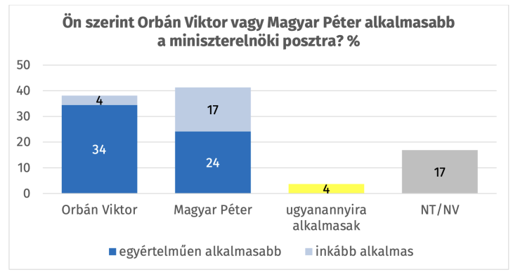 A válaszadók 41 százaléka szerint Magyar Péter alkalmasabb a miniszterelnöki posztra, 38 százalék Orbánt tartja alkalmasabbnak. Bár a Tisza vezetőjét többen tartják alkalmasnak, az Orbán mellett voksolók magabiztosabbak a válaszukban: 34 százalék szerint egyértelmű, hogy Orbán az alkalmasabb, míg Magyar esetében ez az arány 24 százalék.
