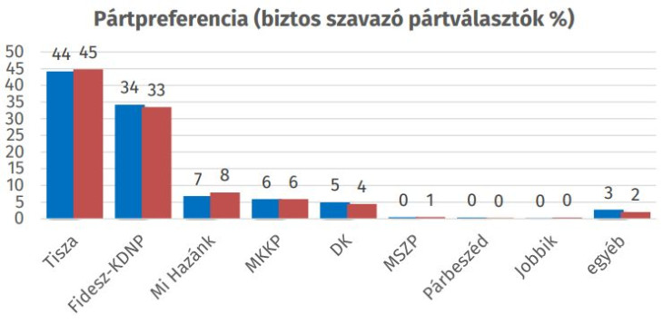 Az intézet szerint a Tisza jelenleg is 6 százalékponttal vezet a Fidesz-KDNP előtt a teljes népességben, az állás 30- 24 Magyar Péterék javára, akár csak múlt hónapban. A pártválasztók körében a Tisza 43, a Fidesz-KDNP 35 százalékon áll, e téren szintén nem történt változás, a különbség 8 százalékpont a Tisza javára.