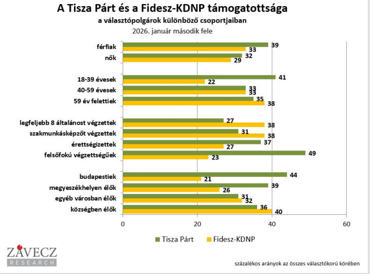 A diplomásoknál kétszeres fölényben van a Tisza Párt (49-23 százalék), és az érettségizettek körében is jelentős az előnye (37-27 százalék). A szakmunkás képzettségűek s még inkább az általános iskolai végzettségűek csoportjaiban viszont a Fidesz-KDNP listának van több támogatója (38-31 százalék illetve 38-27 százaolék), olvasható az elemzésben.