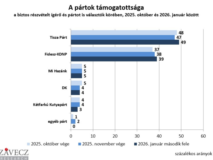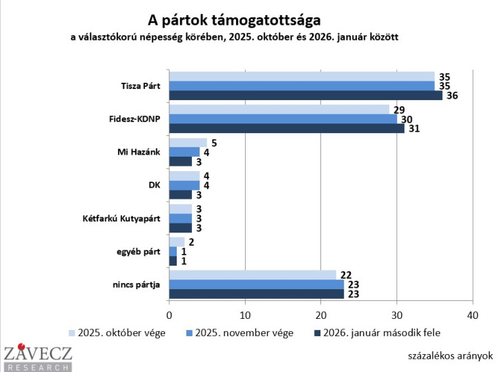 Folytatódott Tisza és a Fidesz-KDNP táborának bővülése: előbbi tavaly nyár óta 32-ről 36 százalékra erősödött, utóbbi 26-ról 31 százalékra, derül ki a Závecz Research legfrissebb, január második felében végzett közvélemény-kutatásából.