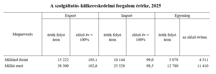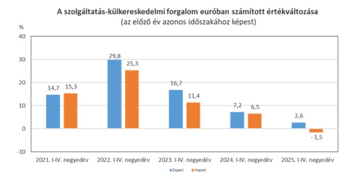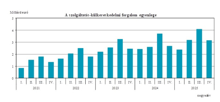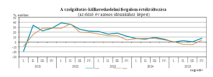 2025 IV. negyedévében a szolgáltatások euróban számított exportja 7,6 százalékkal, importja 3,6 százalékkal bővült az előző év azonos időszakihoz képest. Az előző negyedévhez mérten az export értéke 4,8 százalékkal kevesebb, az importé pedig 6,6 százalékkal több volt, ami 930 millió eurós egyenlegcsökkenést eredményezett – jelentette a KSH.