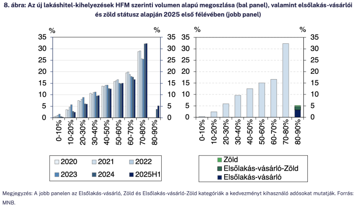 2019-ben még a lakáshitel-kihelyezés mintegy 20 százalékát nyújtották a bankok magasnak tekinthető, 40 százalék feletti JTM mellett, 2025 első felében azonban ez az arány közel a duplájára, 36 százalékra emelkedett.