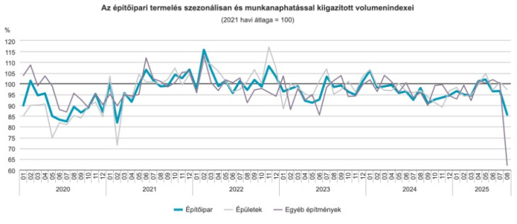 Az építményfőcsoportok közül az épületek építésének termelése 2,3, az egyéb építményeké 34,8 százalékkal esett vissza. A szezonálisan és munkanaphatással kiigazított indexek alapján az építőipar termelése 11,4 százalékkal elmaradt a 2025. júliusitól.