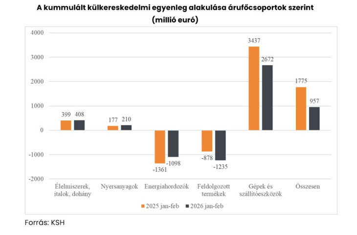 Az energiahordozók behozatalának kumulált forgalma 2026 első két hónapjában 466 millió euróval, míg kivitele 202 millió euróval mérséklődött az előző év azonos időszakához képest. Bár az energiahordozók nettó importja összességében csökkent, az iráni konfliktus nyomán kialakult energiapiaci árnövekedés és az eddigi alacsony importszint miatt a tárolók feltöltésére várhatóan már megemelkedett árakon kerül sor, ami a közeljövőben rontani fogja a külkereskedelmi mérleget.