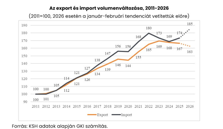 2018-19-től kezdődően az import volumenének növekedési üteme tartósan felülmúlta az exportét. Bár 2024-ben az import markáns visszaesése következtében a két mutató 2011-es bázishoz viszonyított értéke átmenetileg szinte teljesen kiegyenlítődött, ezt követően az olló ismét kinyílt. Az aktuális 2026-os adatok alapján ez a szétválás a jövőben tovább mélyülhet, ami érdemben rontja a külkereskedelmi mérleget.