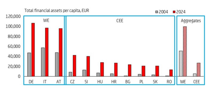 A kutatás megállapítja: a háztartások egy főre jutó pénzügyi vagyona az elmúlt húsz évben közel ötszörösére nőtt Közép- és Kelet-Európában, ahogy a régió gazdaságai fokozatosan közelítettek Nyugat-Európa gazdaságaihoz.