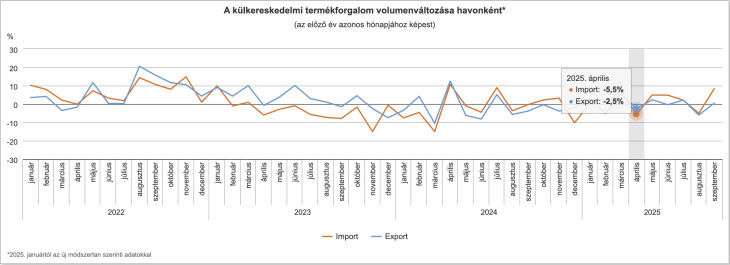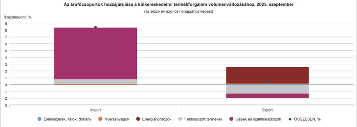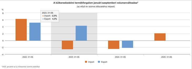 Csalóka, hogy míg a 2025-ös év nyolcadik hónapjában mind a kivitel, mind a behozatal volumene elmaradt az előző év azonos időszakáétól (4,4, illetve 4,1 százalékkal), addig szeptemberben a kivitel volumene 0,5, a behozatalé 8,4 százalékkal bővült az előző év azonos időszakához képest.