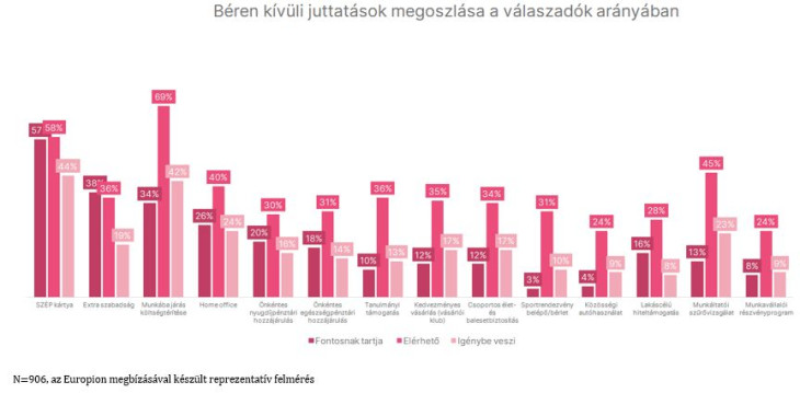 A felmérés eredményei szerint a munkavállalók többsége (57 százalék) a SZÉP-kártyát tartja a legfontosabb béren kívüli juttatásnak. Ezt az extra szabadság (38 százalék), a munkába járás költségtérítése (34 százalék), és az otthoni munkavégzés lehetősége (26 százalék) követi. A sor végén a sporteseményre adható belépőjegy és a közösségi autóhasználat végzett, előbbit a válaszadók három, utóbbit négy százaléka gondolta fontos elemnek. Némileg árnyalja a képet, ha azt nézzük meg, milyen arányban választanak a munkavállalók egy béren kívüli juttatást, amennyiben az valóban elérhető a munkahelyükön. A legtöbben a SZÉP-kártyát (76 százalék) és a munkába járás költségtérítését (61 százalék) veszik igénybe, viszont alig valamivel lemaradva, a harmadik helyen a home office-t találjuk (60 százalék), ami jól mutatja, mennyire fontossá vált az otthoni munkavégzés lehetősége azokban a szakmákban és munkahelyeken, ahol erre lehetőség van.