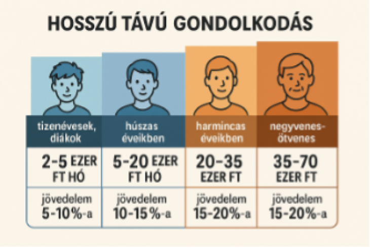 A K&H Ifjúsági Index legfrissebb kutatása szerint az anyagi öngondoskodás egyre nagyobb szerepet kap a fiataloknál. Az időben elkezdett megtakarítás lehetővé teszi, hogy a jövő ne lemondásokról, hanem biztonságról és lehetőségekről szóljon. Bár a 19–29 évesek több mint fele már rendelkezik megtakarítással, ezek többsége még rövid távú tartalék. A hosszú távú gondolkodás azonban nem feltétlenül jár nagy anyagi teherrel, a tinédzserként vagy diákként félretett havi 2–5 ezer forint idős korban komoly előnyökkel járhat. A húszas éveikben járók számára a jövedelmük 5–10 százalékának – például havi 5–20 ezer forintnak – rendszeres megtakarítása segíthet az első biztonsági tartalék kialakításában. A harmincas évekre ez az arány 10–15%-ra növelhető, havi 20–35 ezer forint pedig már a hosszú távú pénzügyi stabilitást szolgálja. A negyvenes–ötvenes korosztály esetében a pénzügyi tervezés egyre szorosabban összekapcsolódik az egészségmegőrzéssel és az aktív életmóddal. A 15–20 százalékos jövedelemarányú, havi 35–70 ezer forintos megtakarítás hozzájárulhat ahhoz, hogy az életszínvonal és az aktivitás az időskorban is megmaradjon.