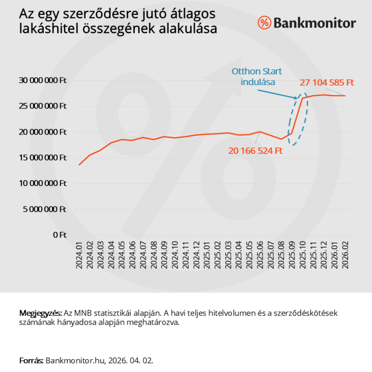 Az összvolumen tehát nem kis részben azért nőtt, mert az egy szerződésre jutó átlagos összeg is érdemben megemelkedett, azaz egy adós több hitelt vesz fel lakása megvásárlásához, mint korábban.